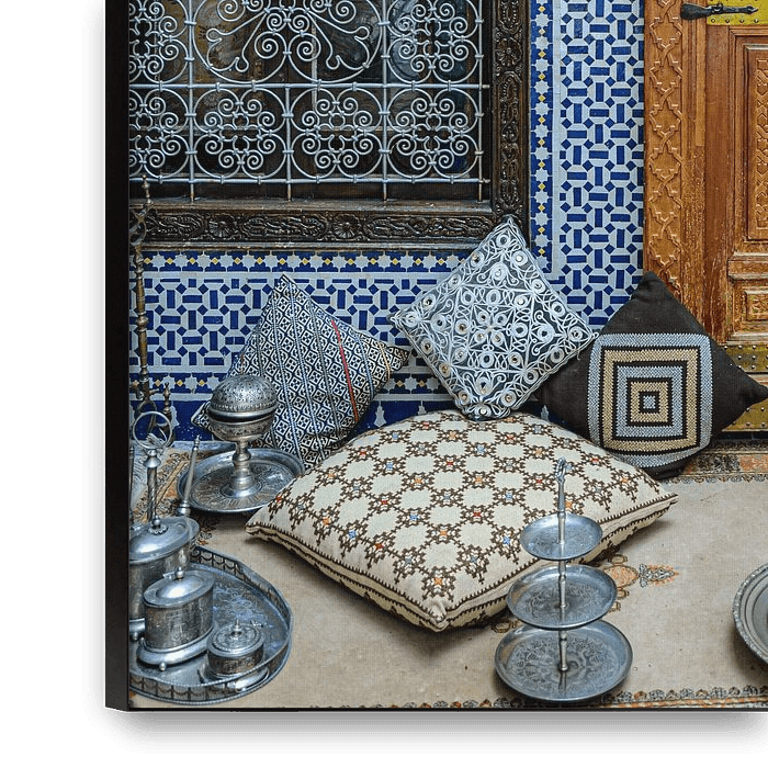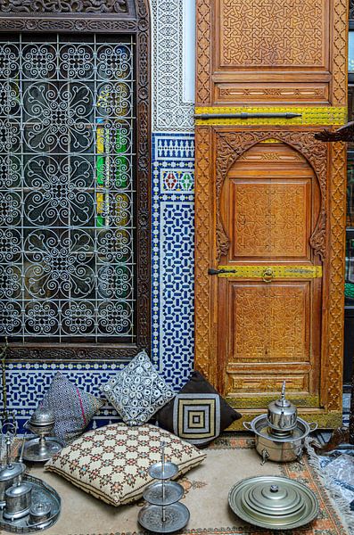 Typical Moroccan riad with window and door with ornaments and cushions for tea ceremony
