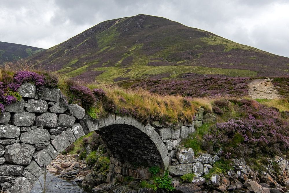 Very romantic picture with a lovely stone bridge over a flowing river in a mountain landscape. here, whole mountains are covered with heather, so purple where you see.