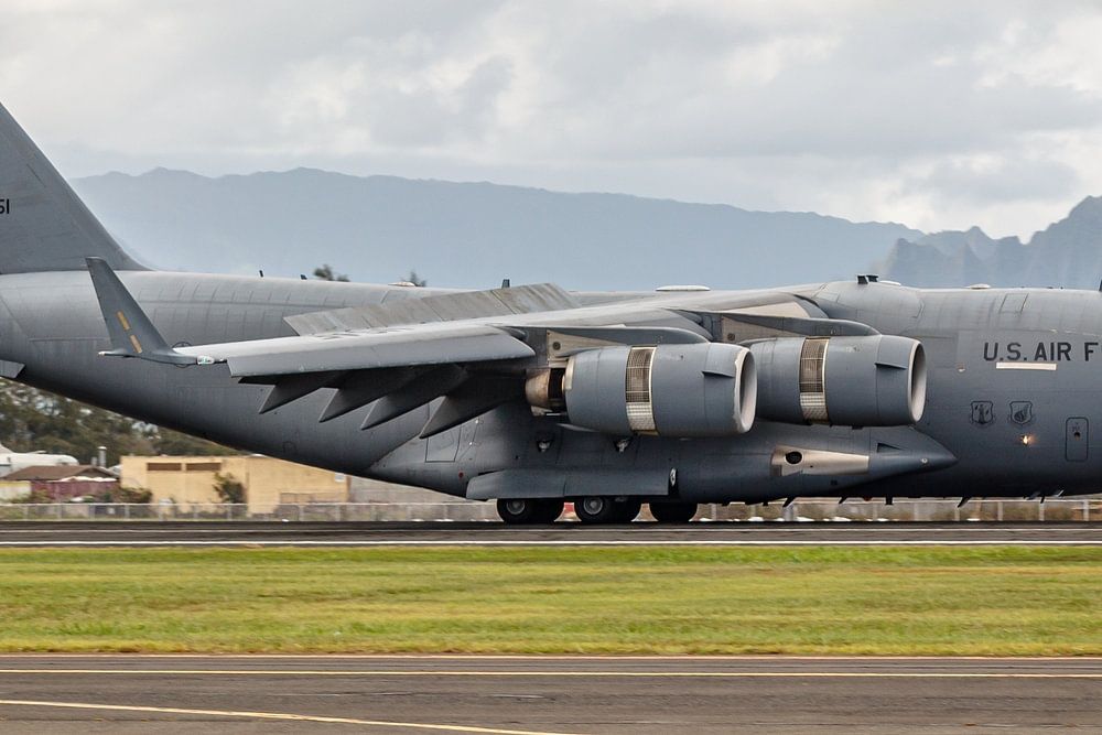 A U.S. Air Force Boeing C-17 Globemaster III lands at MCAS Kaneohe Bay during the airshow on Sept. 30, 2012.