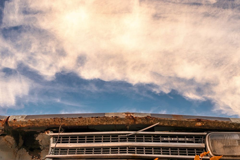 an American car photographed from below. A beautiful cloudy sky adorns the picture.