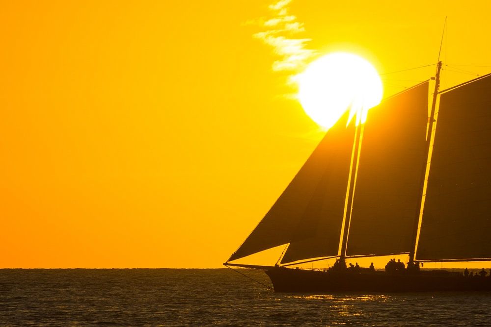 USA, Florida, Sailing ship with orange sunset sky behind sails by adventure-photos