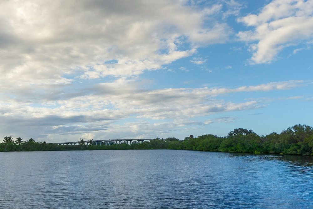 About "USA, Florida, Waterfront with green trees and plants behind and bridge with traffic"