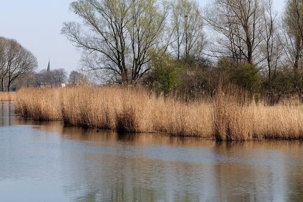 Ubbergen Gelderland The Netherlands. View along the Lake along the Dijkgraaf van Wijckweg. Golden reeds, grasses and trees reflected in the waters on a sunny March afternoon.
