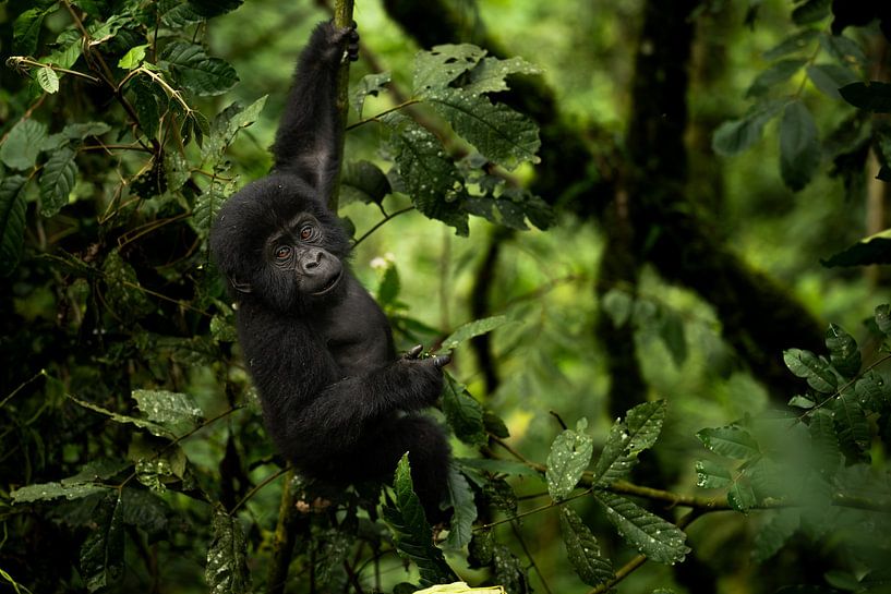 The mountain gorilla is an endangered species and therefore extra special to see this youngster swinging around so freely and safely, and to have a moment's eye for the camera.