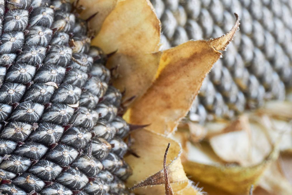 Close-up van uitgebloeide zonnebloem koppen op een houten plank met rijpe grijze zaden en gele bladeren aan de rand