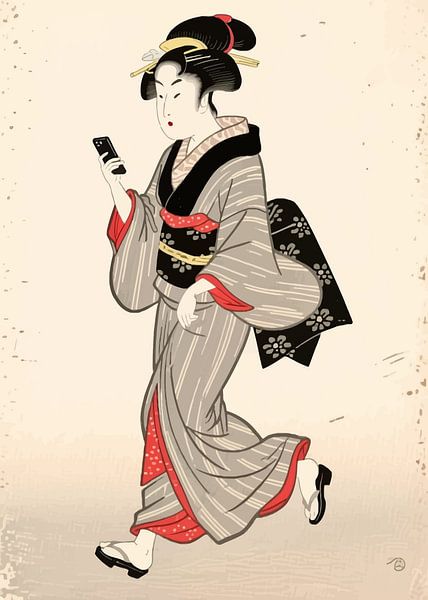 Buy this japanese art Ukiyo-e Comedy Poster – Geisha Walking While Texting Meme Art by MIROKKU on canvas, ArtFrame, poster and wallpaper, printed on demand in high quality.