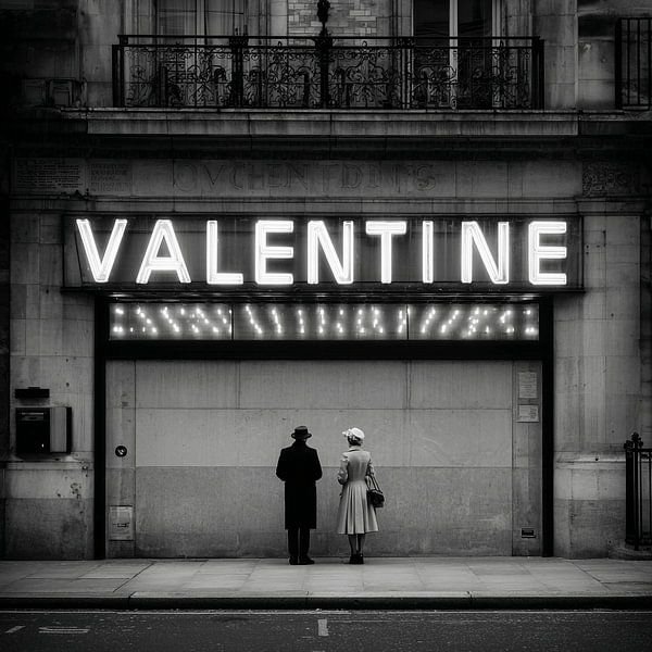 Nostalgic black-and-white photo of a couple hand-in-hand in front of an old cinema with large illuminated neon sign "VALENTINE", in an empty street with vintage atmosphere.