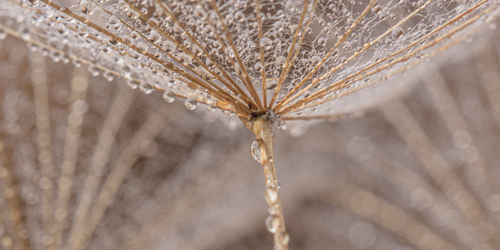 The depth of field is very small, (only a few millimeters of the fluff in the middle and some water droplets) this creates a dreamy atmosphere and also a sense of depth in the work.