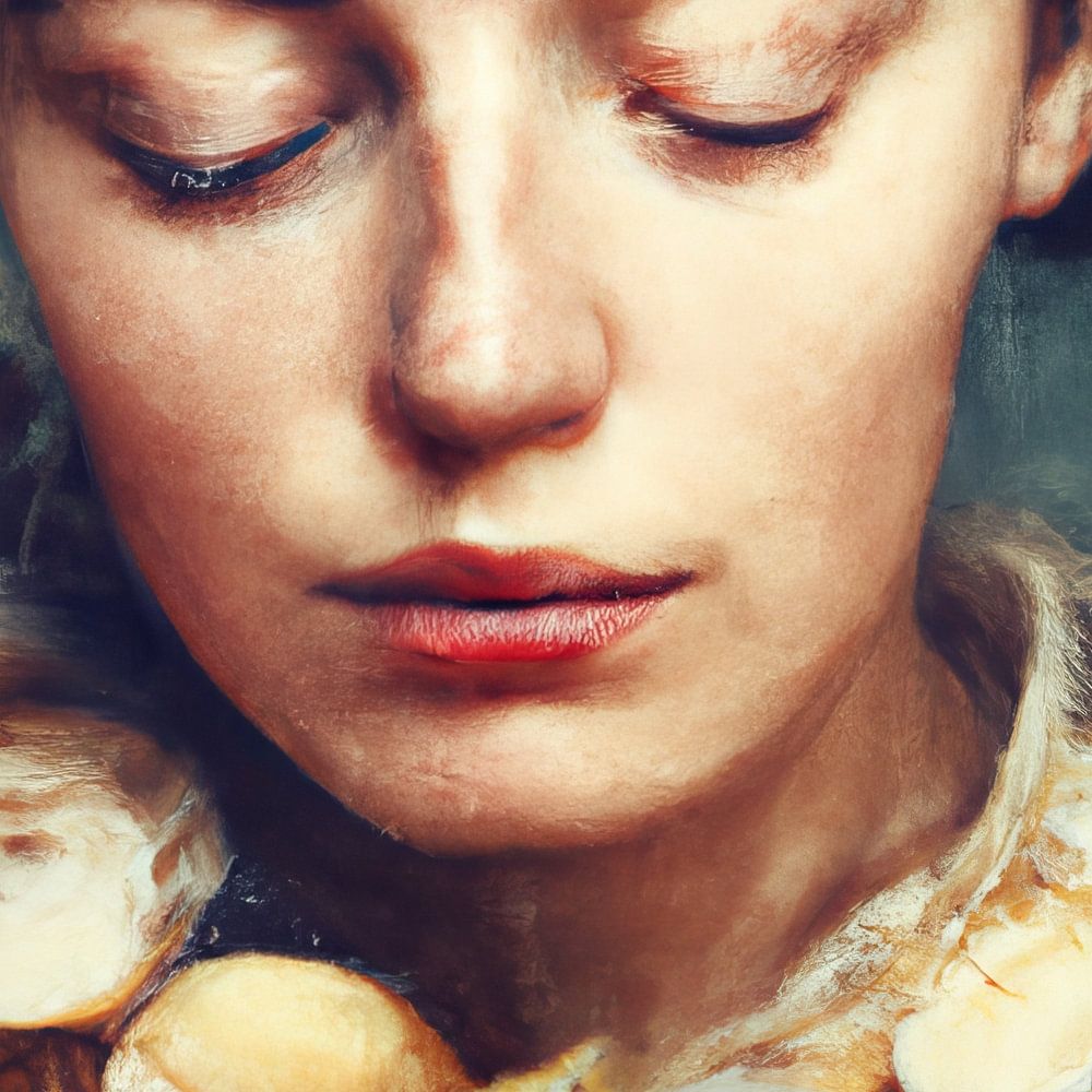 Underwater dream: painting of a woman with closed eyes underwater with a large shell necklace. Soft colours against a teal background, the water's edge is visible at the top.