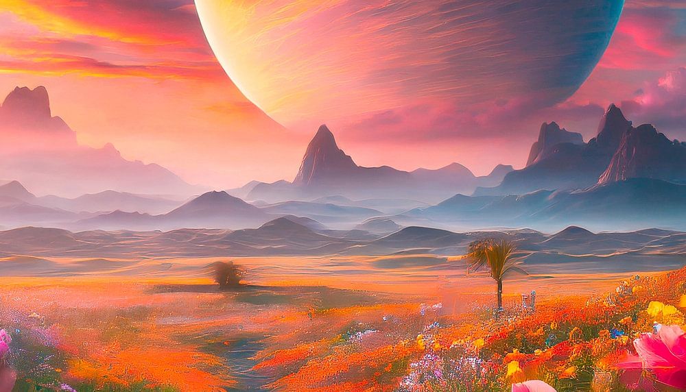 Buy this landscape artwork Universe planets with landscape by Mustafa Kurnaz on canvas, ArtFrame, poster and wallpaper, printed on demand in high quality.