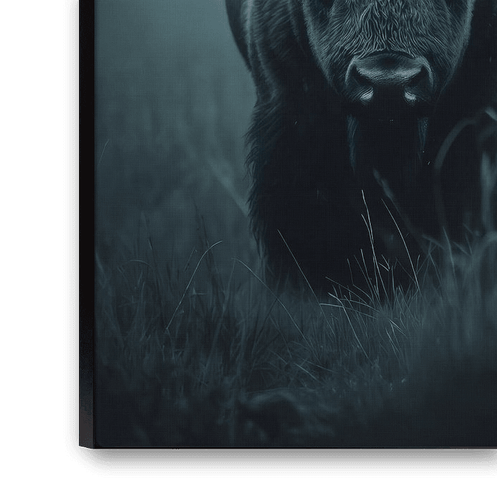 "Untamed Strength" captures the imposing presence of a bison emerging from the mist. The dark tones and surrounding haze give the image a mysterious and powerful look. The bison's muscular build and sharp horns are beautifully highlighted by the soft, muted light. This composition exudes a sense of calm and untamed wild nature, making it a perfect work of art for interiors that want to add a touch of natural power and mysticism.