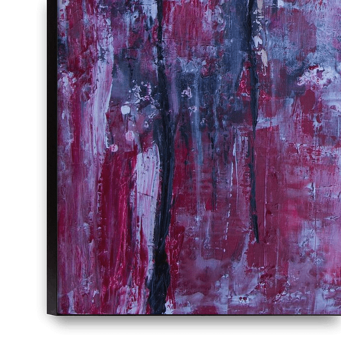 A striking painting with vibrant colours, particularly shades of purple, orange and magenta.