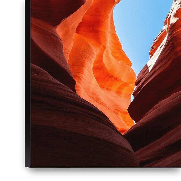 Looking up from the depths of Antelope Canyon, a spectacular image of the blue sky unfolds, perfectly framed by the narrow, winding walls of red sandstone. This particular perspective shows the dramatic play of sunlight falling through the narrow openings, creating a mesmerising interplay of light and shadow. The vertical shot captures…