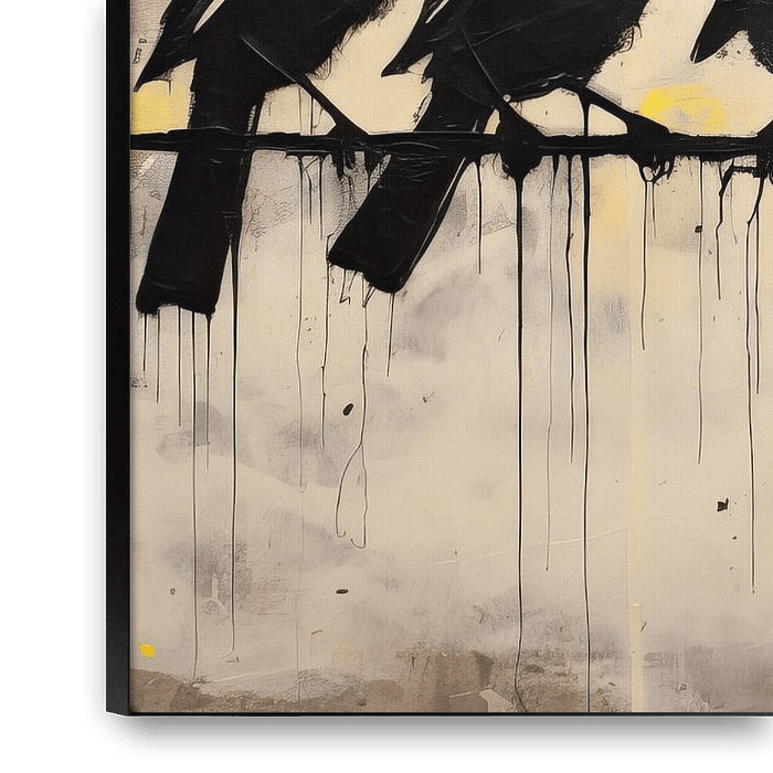 Urban Bird Art | Crows - With an almost tangible intensity, this row of crows on a wire steals the show against a backdrop of subtle beige and splashes of yellow. The dramatic black and white contrasts and flowing droplets give it a raw, urban edge, while the yellow accents add an unexpected vibrancy.