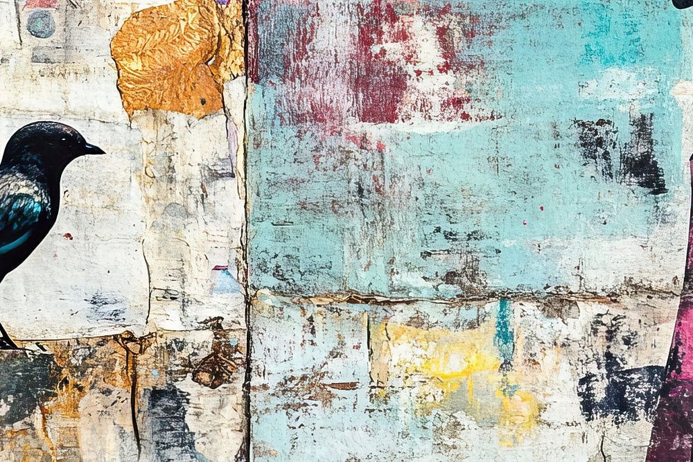 Urban Bird - This is an urban art painting featuring a silhouette of a young girl on the right, looking at a black bird on the left, against a background of colourful, weathered abstract textures.