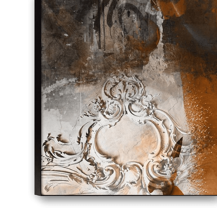 A painting in Urban Street Art design. In this digital collage, I placed multiple layers of images on top of each other and let them shine through into each other. The images alternate from a portrait, to fabrics and textures, texts and posters. This creates a layered portrait, with a delicious dose of cheekiness. A tough street art vibe of torn off posters in the soft, modern, but also tough colors of orange brown, taupe, gray, black and white.