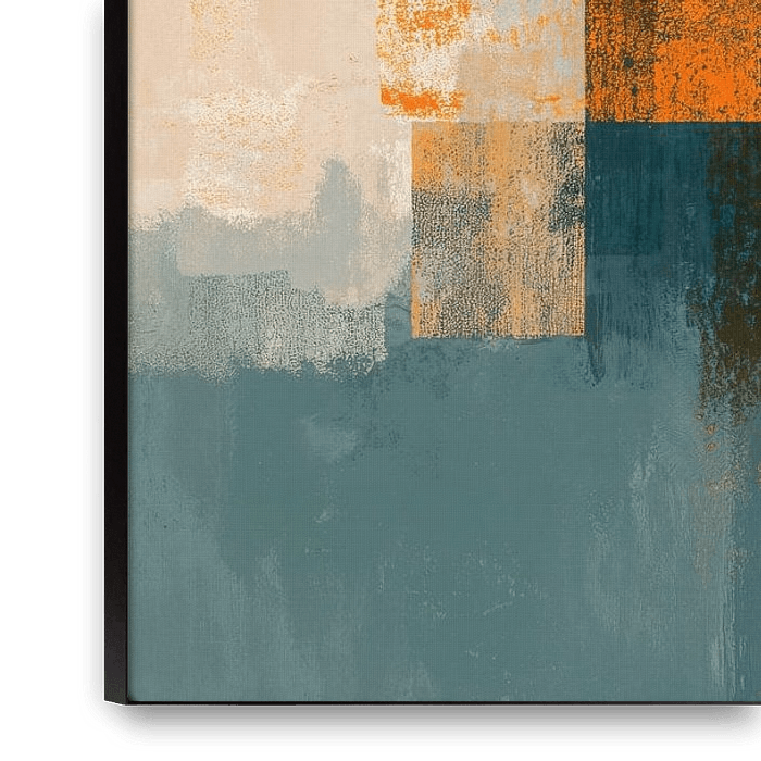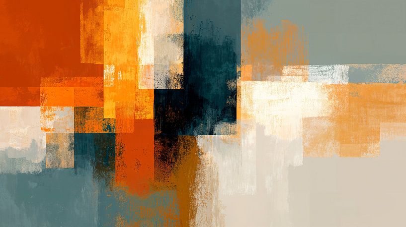 An abstract painting with a dynamic composition of geometric shapes and blocks, featuring a colour palette dominated by warm tones complemented by soft beige shades and muted grey. A modern minimalist style that evokes a sense of movement and energy.