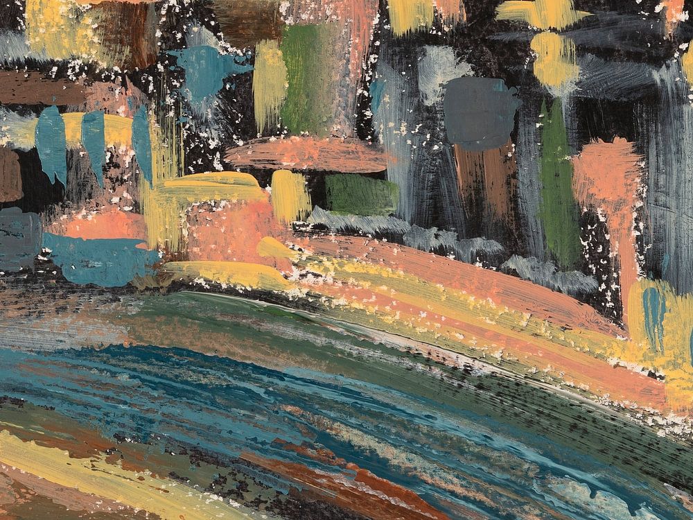 The painting 'Urban Portal' captures the dynamics of urban movement in paint and texture. With powerful paint strokes and contrasting shades of pink, blue, brown and grey, it creates a composition of a waterway flowing towards the beginning of the city. The work depicts the rhythm and movement of urban life.