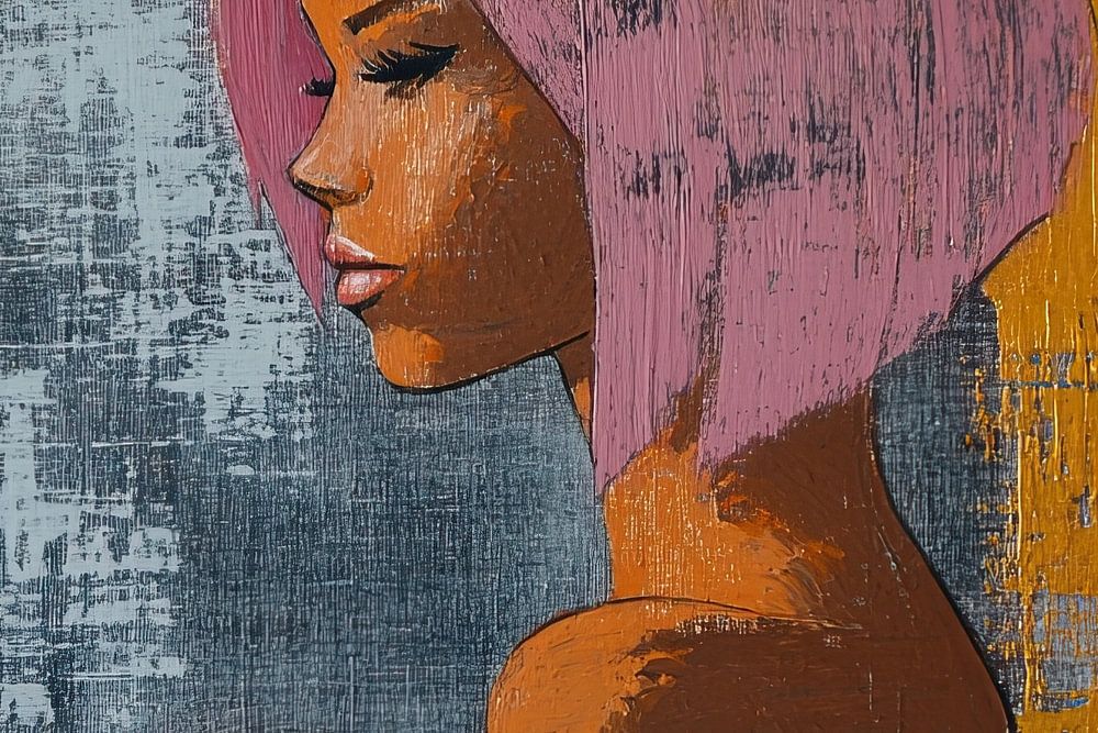 Details: woman, pink hair, urban art, industrial art, profile, texture, gold, grey, modern, canvas