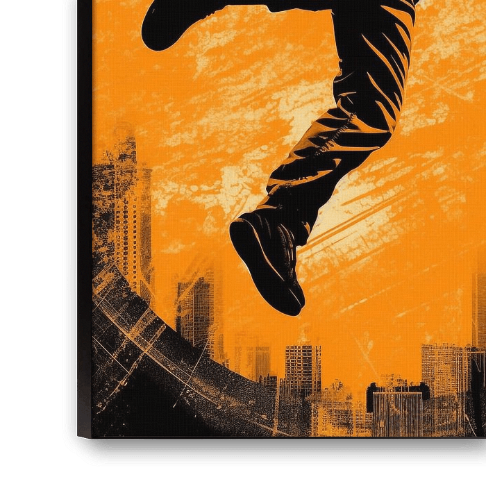 Dynamic artwork of a young human figure in free, expressive and energetic movement. Symbolising the vibrancy and energy of the colourful urban environment.
