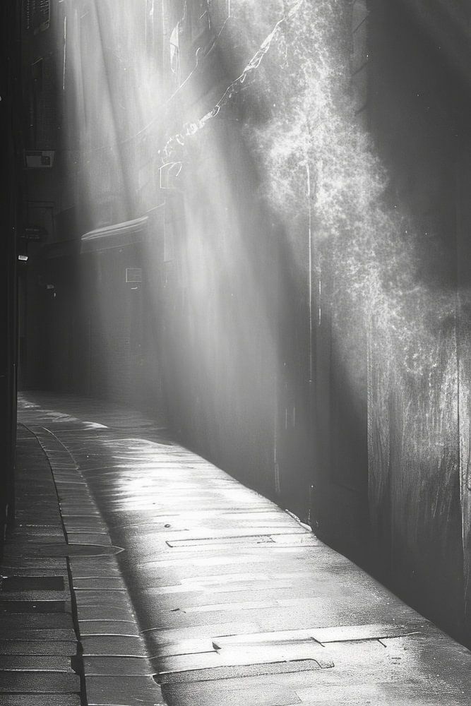 This black and white photograph captures the essence of urban landscapes by showing the interplay of light and shadow in the narrow streets of the city. The image draws the viewer into a world where rays of sunlight dramatically break through the skyscrapers and bridges, creating a magical, almost mystical atmosphere. Perfect for lovers of urban and architectural photography who appreciate the timeless beauty of urban environments in their purest form.
