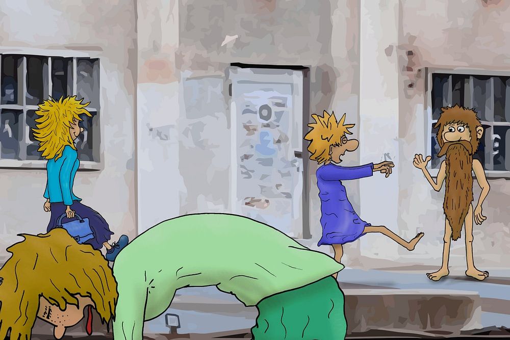 Hand-drawn comic figures, inserted into digitally processed photos of actual landscapes, conditions and objects.