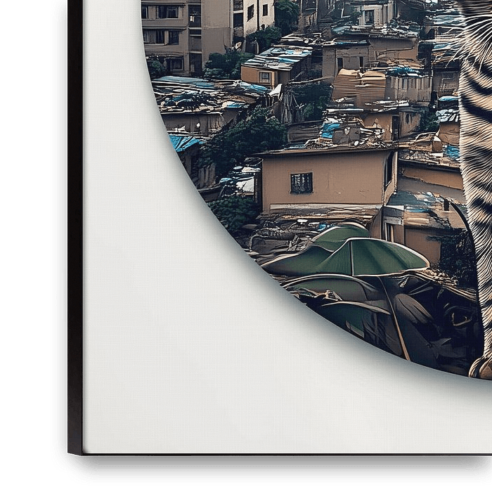 Amidst the towering skyline and dense urban development, a majestic Bengal cat sits enthroned with an air of calm authority. In its piercing green eyes lies the wisdom of a city's untold stories, uniting the wild and the metropolitan in a single, captivating gaze. The contrast between the grace of nature and the structured chaos of the…