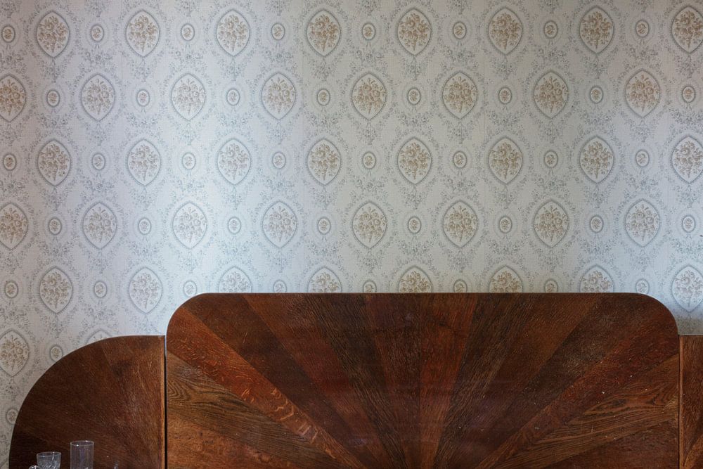 Bedroom with retro wallpaper on the 1st floor of an old villa.