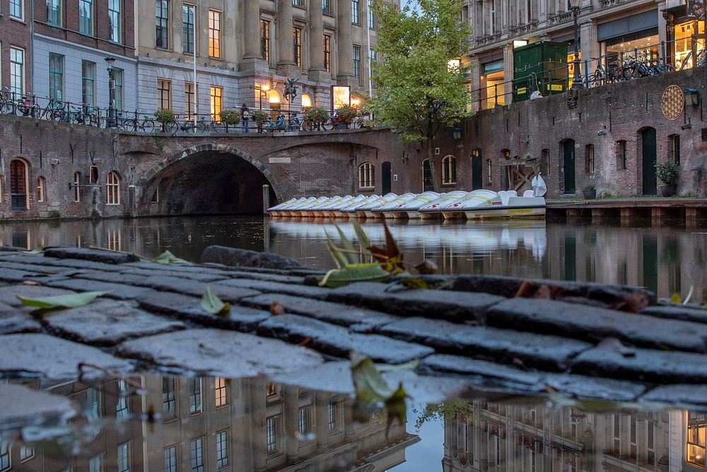 Utrecht Oudegracht with City Hall and City Hall Bridge with reflection in a pond on the ancient monumental wharf.