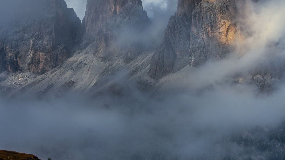 The Val Gardena is almost completely shrouded in clouds. A little bit, the mountain range squeaks through the clouds, but some time later it is completely surrounded by the clouds again.