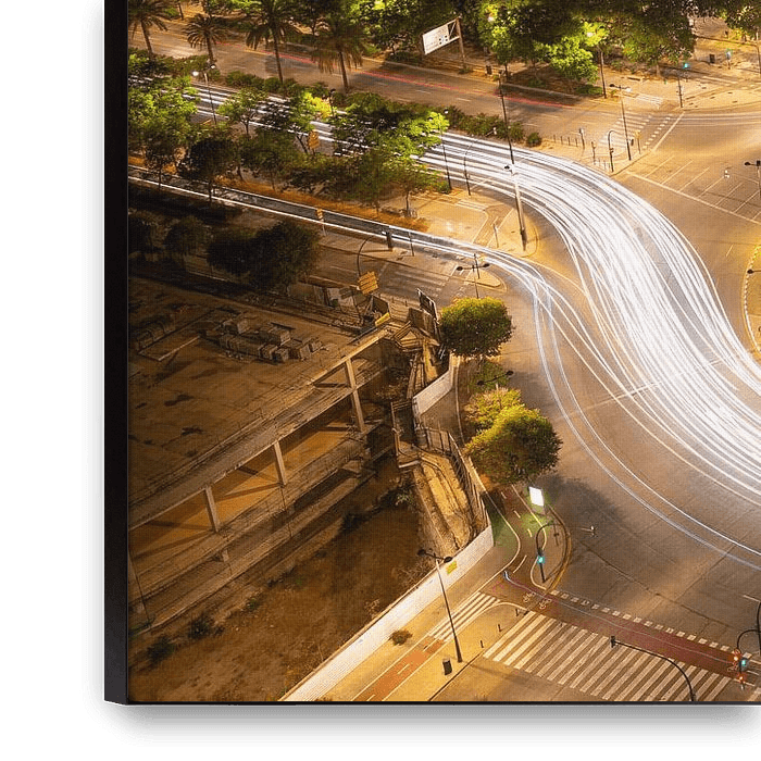 Picture of the skyline of Valencia. The car lights form light trails on the roads.