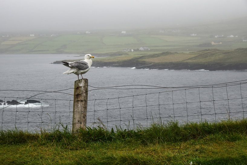A gull rests on a post on a misty and windy summer day. Photo taken near the coast of Valentia Island in western Ireland.