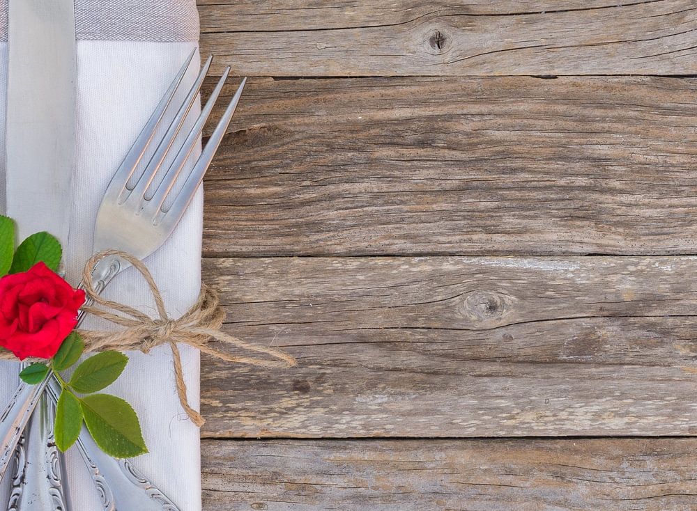 Valentines day or wedding table place setting with romantic rose flower on wood background, copy space, greeting card, Table setting