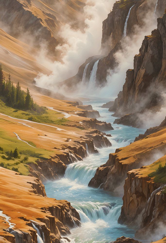 Discover the otherworldly beauty of the Valley of Geysers in Kamchatka Peninsula with this striking oil painting illustration. This digital wall art captures the atmospheric landscape of the valley, showcasing its dynamic geysers, steaming fumaroles, and unique geothermal features set against a backdrop of rugged terrain. Perfect for adding a touch of natural wonder and dramatic energy to your space, this artwork evokes the raw splendor and geothermal marvels of one of Russia's most remarkable natural sites.