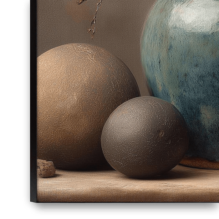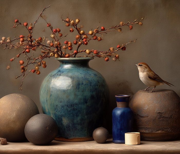 Vase and Berries - This floral painting is a Japandi still life centred around a large patina-blue vase filled with dried berries and graceful branches, alongside various ceramic vases and a small brown bird perched on a vase, painted in warm earth tones with soft blue accents — ideal as a floral painting or a painting of flowers for a…