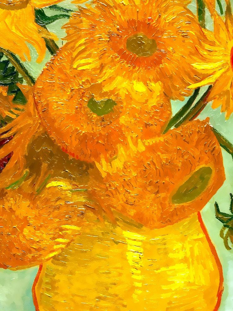 Of the sunflower series there are three paintings with fifteen sunflowers in a vase and two paintings with twelve sunflowers in a vase. Van Gogh first painted this painting, a vase with twelve sunflowers, which hangs in the Neue Pinakothek Museum in Munich, Germany. The later paintings came into being in January 1889. Vincent Van Gogh began painting the works at the end of the summer of 1888 and continued doing so a year later. The paintings went to his friend Paul Gauguin as decoration for his bedroom. The paintings depict different periods of flowering of the sunflowers, from full bloom to wilderness. New was the use of the many yellow colours. In a letter to his brother Theo van Gogh Vincent wrote: somehow the sunflower is mine.