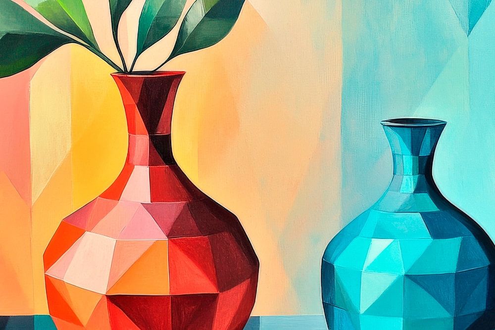 Vibrant geometry meets organic elegance: two multi-faceted vases, one in bright red and the other in cool blue, are accompanied by fresh leaves against a mesmerising, colourful background. This harmonious composition adds a modern accent to any living room and invites you to linger. Ideal for creative rooms full of life!