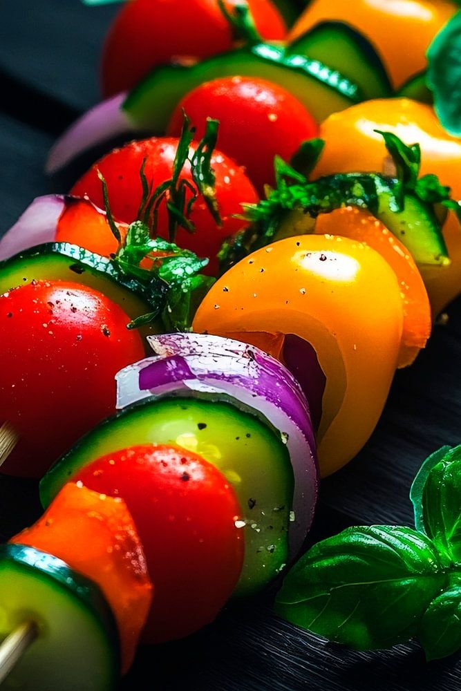 Vibrant colours and fresh ingredients immediately catch the eye! Juicy tomatoes, crunchy peppers and aromatic basil are artfully strung together on a skewer. This appetising composition makes kitchen décor shine and inspires culinary adventures. A real pleasure highlight for every kitchen lover!