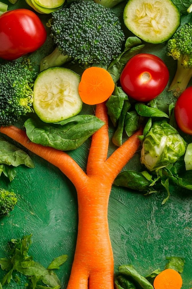 A vibrant vegetable tree unfurls its colourful fruit and foliage on a rustic background. Bright apples and vibrant carrots dance harmoniously with green broccoli and delicate cucumber slices. This creative composition brings fresh energy and health to any kitchen and inspires you to cook and savour. Ideal for an inviting atmosphere!