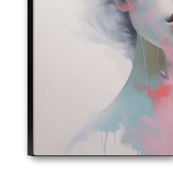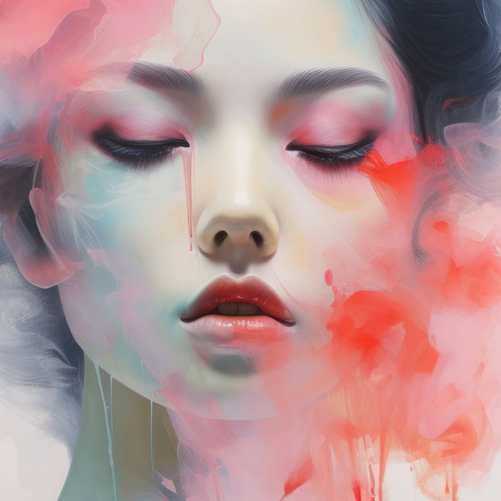"Veil of Dreams" is an intriguing work of art that embodies the ethereal nature of dreams and the ephemerality of beauty. The female portrait, with eyes closed and a soft expression, seems to sink into a haze of pink and white smoke, symbolic of the mysterious world of dreams. The paint droplets that seem to drip off the canvas add a raw, unpolished dimension to the work, creating an interesting contrast between the refined beauty of the subject and the rampant chaos of the surroundings. This piece would be a serene yet provocative addition to any space, ideal for an environment that values both tranquillity and artistic depth.