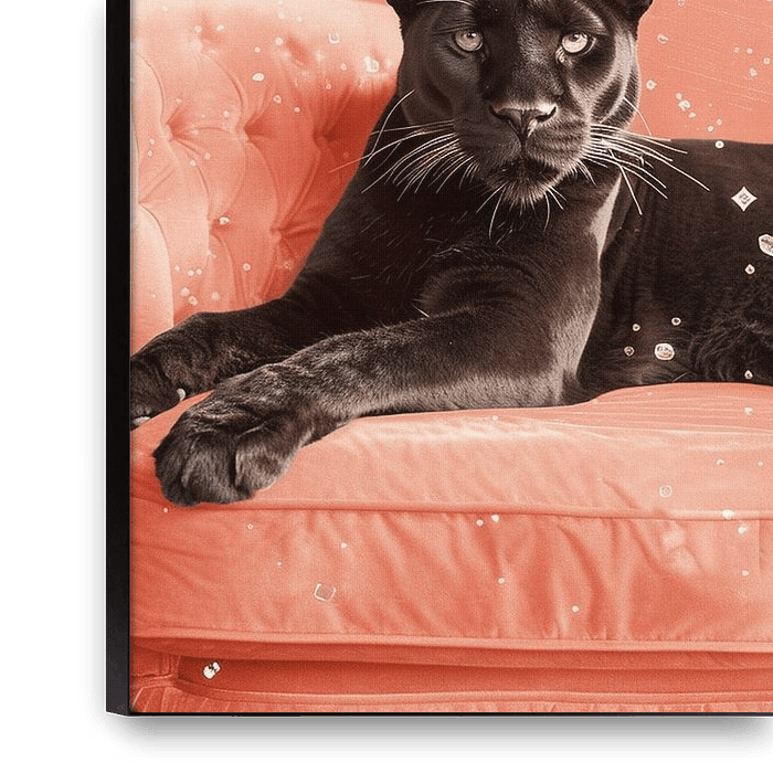 A sleek black panther reclines gracefully on a soft coral sofa, surrounded by floating crystalline particles that add a surreal, dreamlike touch. The warm background contrasts beautifully with the panther’s dark elegance, creating a bold yet refined statement artwork.