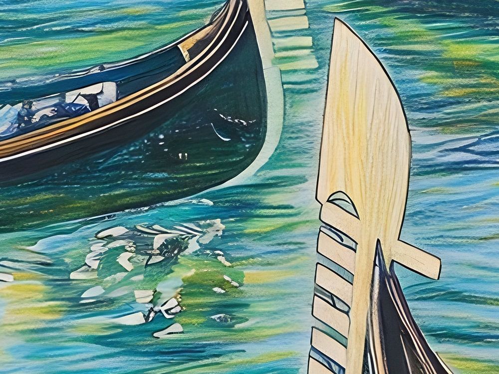 A vibrant artistic rendition of gondolas floating on the shimmering waters of Venice, Italy. The reflections and flowing colors capture the timeless charm and romance of this iconic city.