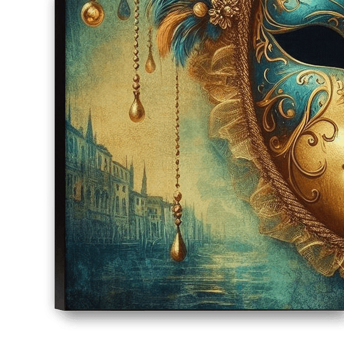A digital artwork of a Venetian mask, traditionally worn during carnival. It is made in a vintage style, reminiscent of old classical paintings. The mask is decorated with beads and flowers. The warm colours gold, blue and green add a chic touch to your interior.