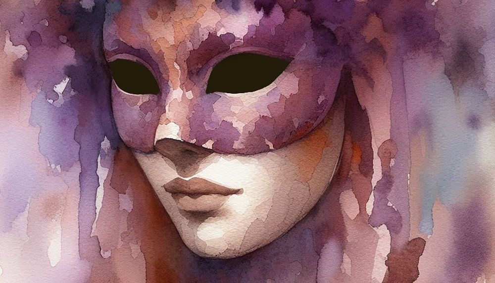 A digital artwork of a female portrait with a Venetian mask. It is created in the loose and flowing style of a watercolour in different colours.