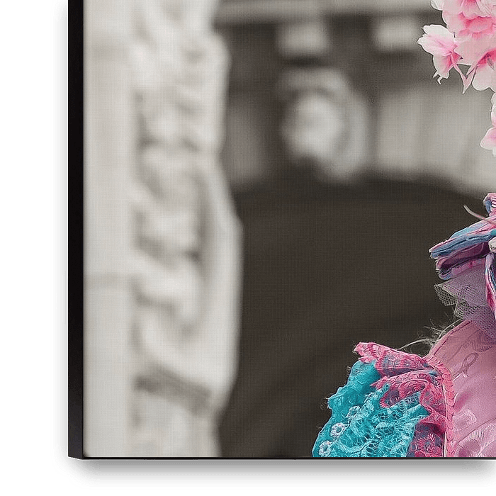 Stunning costume against the backdrop of Venice at sunset during the Venice Carnival
