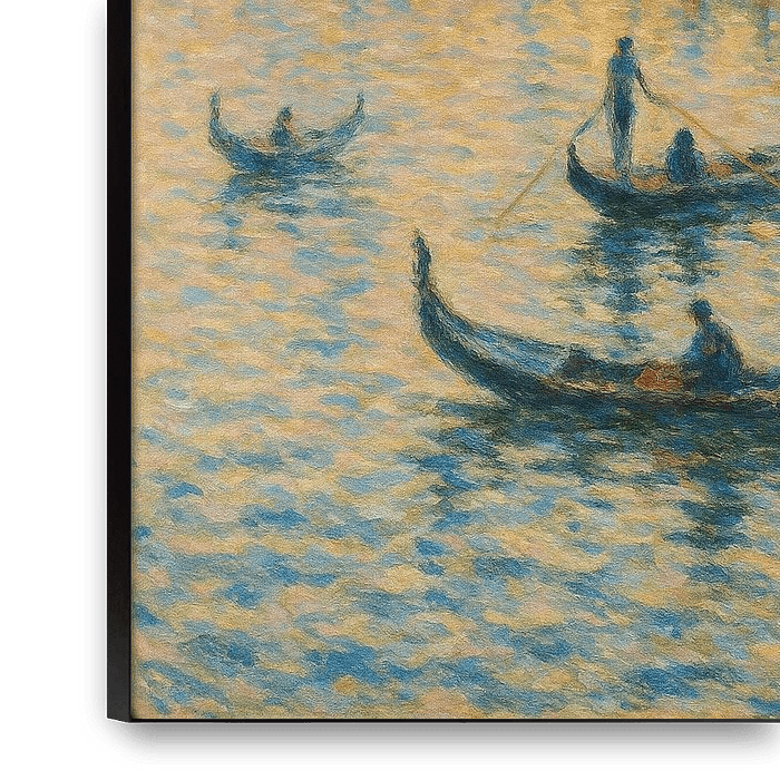 This enchanting artwork captures Venice in one of its most poetic moods: quiet, pastel-tinted, and gently waking under the soft glow of early light. Gondolas drift effortlessly along the shimmering water, their dark silhouettes creating a graceful contrast against the luminous architecture rising behind them. Warm yellows, delicate…