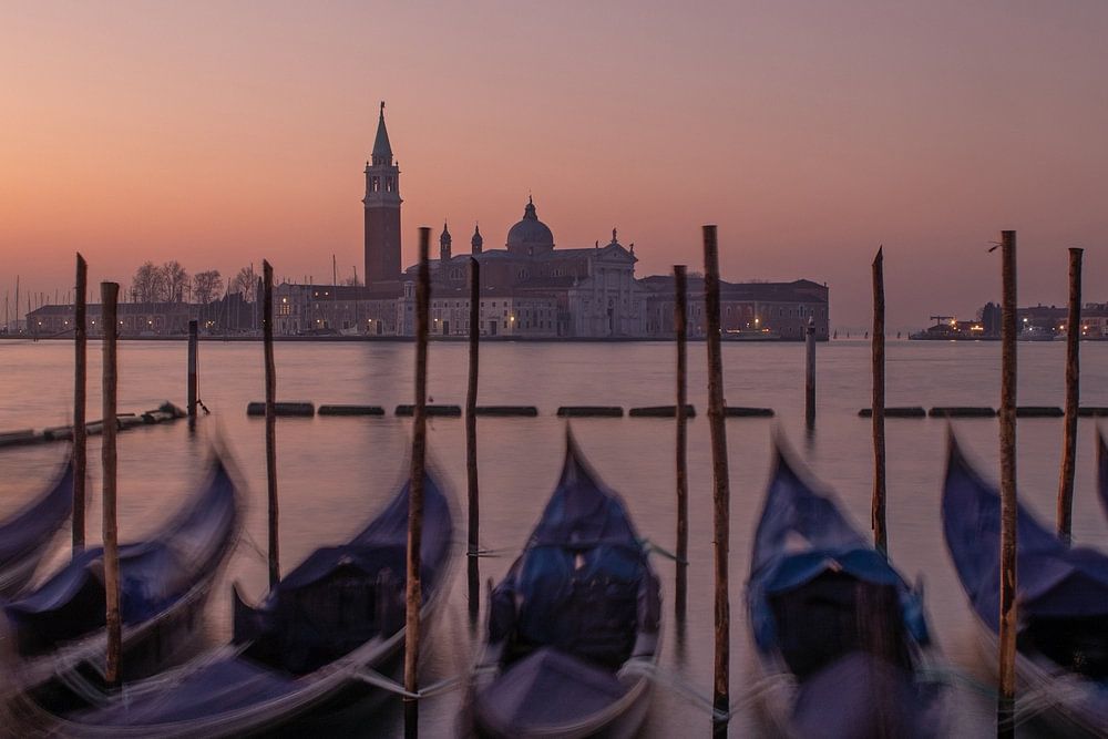 The Riva degli Schiavoni is considered one of the most important quays in Venice. It extends from St Mark's Square eastwards to the Giardini pubblici. Five canals break through the Riva from the north. They are spanned by just as many bridges. This shot was taken at sunrise with long exposure to make the movement of the gondolas on the waves visible. In the background you can see the Basilica di San Giorgio Maggiore.