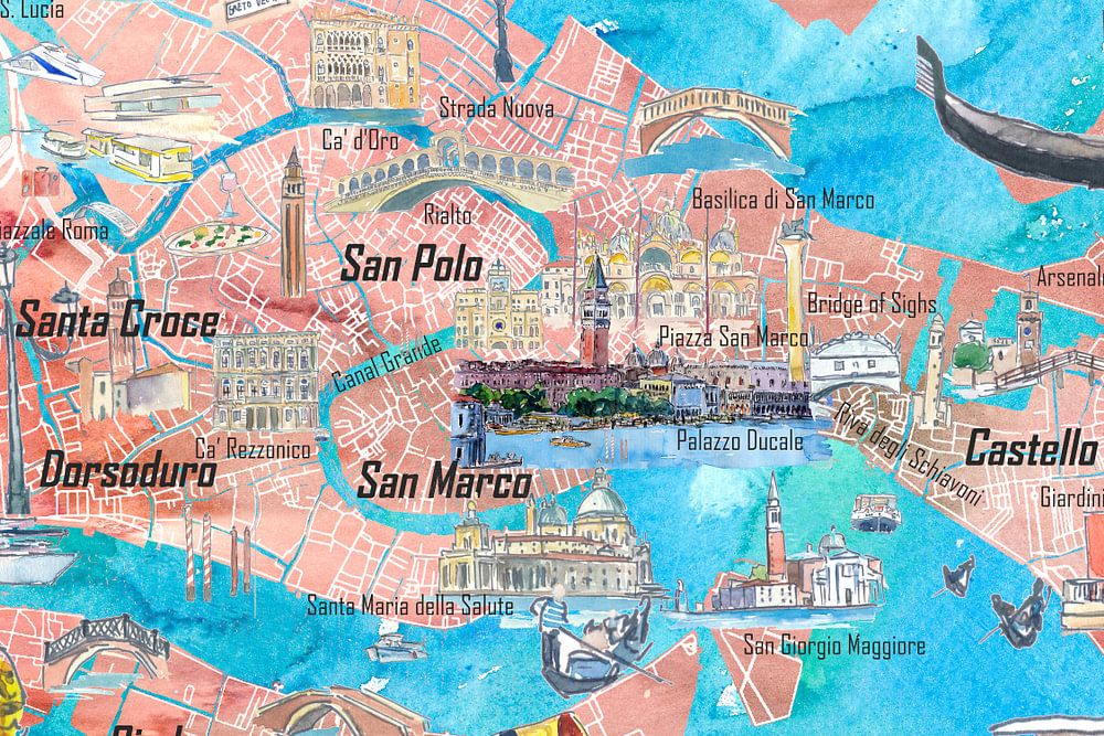 About "Venice Italy Illustrated Map with Main Canals Landmarks and Highlights"