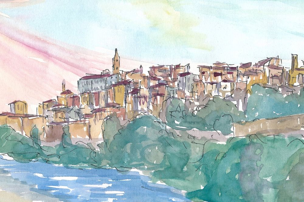 Buy this painting Ventimiglia Liguria Italy panorama with river Roia by Markus Bleichner as a reproduction on canvas, ArtFrame, poster and wallpaper, printed on demand in high quality.
