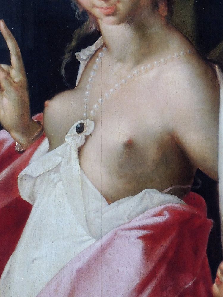 Here is the putto for the woman who wears her dress so low that her breasts are sexy naked and she stands topless on the artwork. The redheaded woman is also standing here with her shoulders bare and her finger in the air as if giving her son a life lesson.